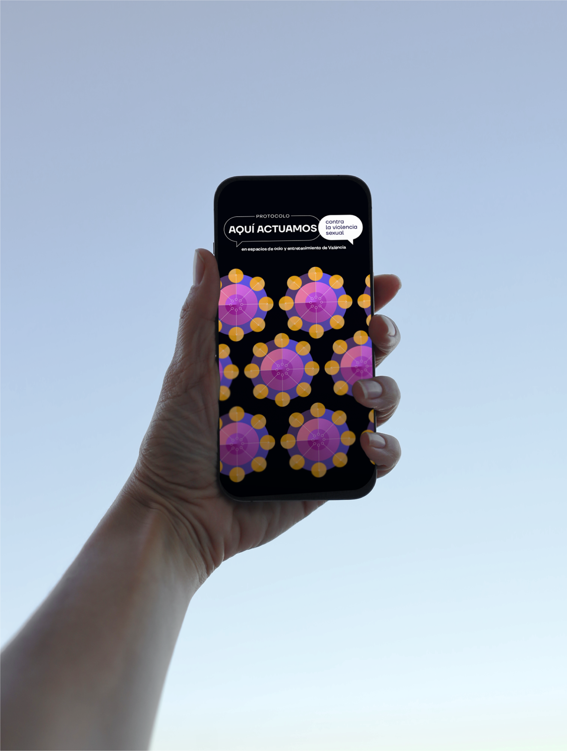 El concepto central de este diseño se inspira en la idea de una rueda protectora, un símbolo de seguridad y protección que envuelve a la víctima, transmitiendo una sensación de cuidado y resguardo. Este elemento visual se integra en la identidad del protocolo para reforzar el objetivo principal: garantizar un entorno seguro en los locales de ocio y entretenimiento. La persona afectada, simbolizada por el punto violeta, alza la voz contra el acoso, al mismo tiempo representamos la sensación de protección y seguridad, por los círculos concéntricos. Este punto violeta. se convierte en una llamada de alerta, señalando la necesidad de tomar medidas contra el acoso, mientras que los círculos concéntricos expresan el resguardo que esta persona experimenta. La combinación de la paleta cromática no solo crea una estética visualmente atractiva, sino que también refuerza el mensaje del protocolo. Cada color ha sido seleccionado estratégicamente para contribuir a la narrativa de seguridad y bienestar en los locales de ocio, garantizando que la identidad visual sea tanto efectiva como impactante.